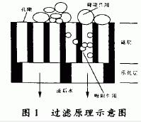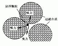 过滤是用过滤介质(滤料) 对作为分散相的悬浮物进行拦截而允许作为连续相的水通过来实现两相分离的过程。典型过滤设备的结构包括滤层和承托层,图1为抽象的过滤原理示意图。过滤介质对悬浮物的拦截作用可分为筛除作用和吸附作用。筛除作用是针对较大的悬浮颗粒, 由于不能通过滤层而被截留在滤层的表层;而较小的悬浮颗粒尽管可以进入滤层,但这些颗粒在通过滤层时与过滤介质接触而被吸附在滤层中被滤除, 这就是吸附作用。对于象砂滤池等深床过滤器,可以滤除的颗粒远小于滤层的孔隙,说明其工作机理主要是吸附作用而不是筛除作用。